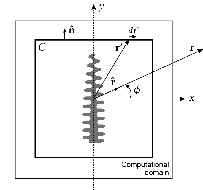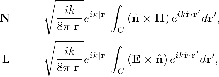 where r is a position vector in far-field, ř = r/|r|, C is a closed integration path, r' is a position vector on C, and ň is a unit vector normal to C. The transformation of N and L from Cartesian to cylindrical coordinates is given by