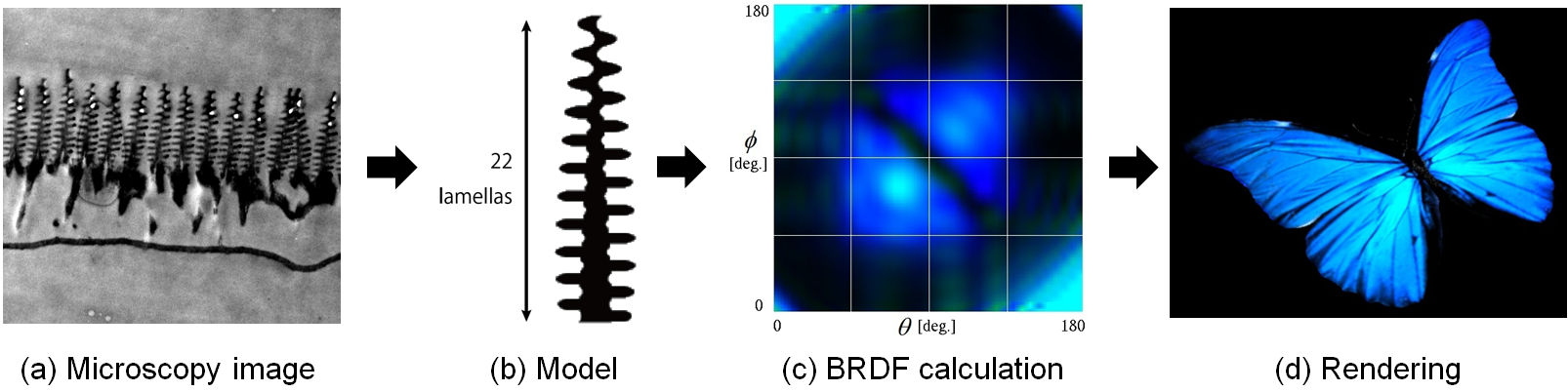 Fig. 1. Pipeline to render the structural color of a male Morpho butterfly: (a) Transmission electron microscope image of a butterfly scale. Numerous photonic crystal-like ridges are visible. (b) Model of a single ridge. Diffraction spots due to a periodic structure can be canceled out by the averaging effect of ridges with random heights on the butterfly scales. (c) Simulated nano-optics based bidirectional reflectance distribution function (BRDF) (θ = incidence angle, φ = reflection angle). The BRDF is obtained using the near-to-far field transformation and the color system transformation. (d) Rendered image of a male Morpho butterfly.